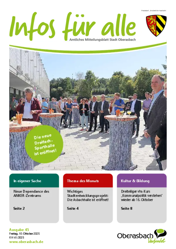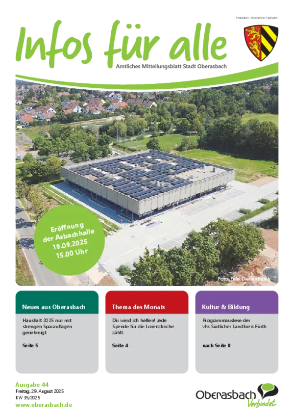 Hier finden Sie das amtliche Mitteilungsblatt der Stadt Oberasbach als PDF-Download. Die neuesten Ausgaben von "Infos für alle” stehen zudem als blätterbares E-Paper zur Verfügung.