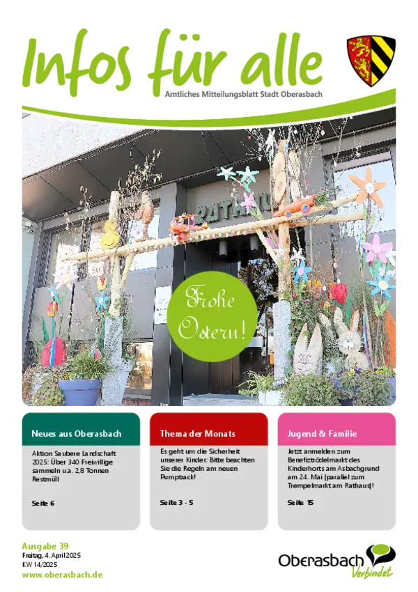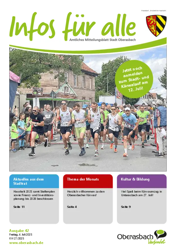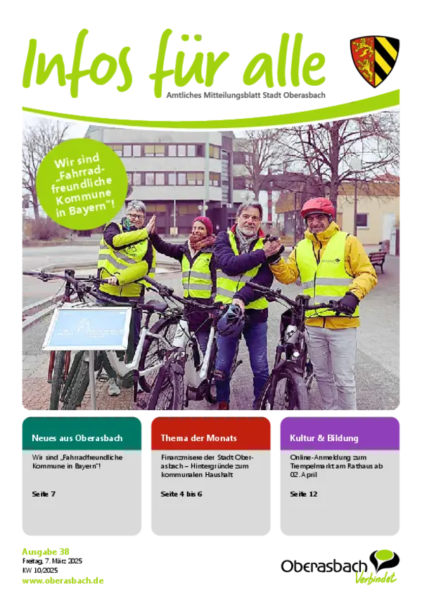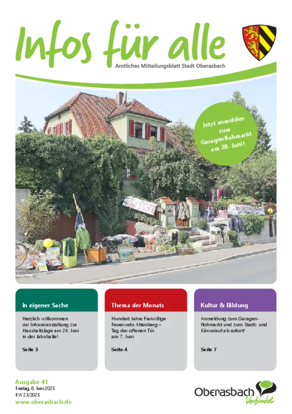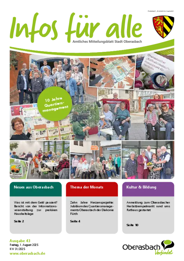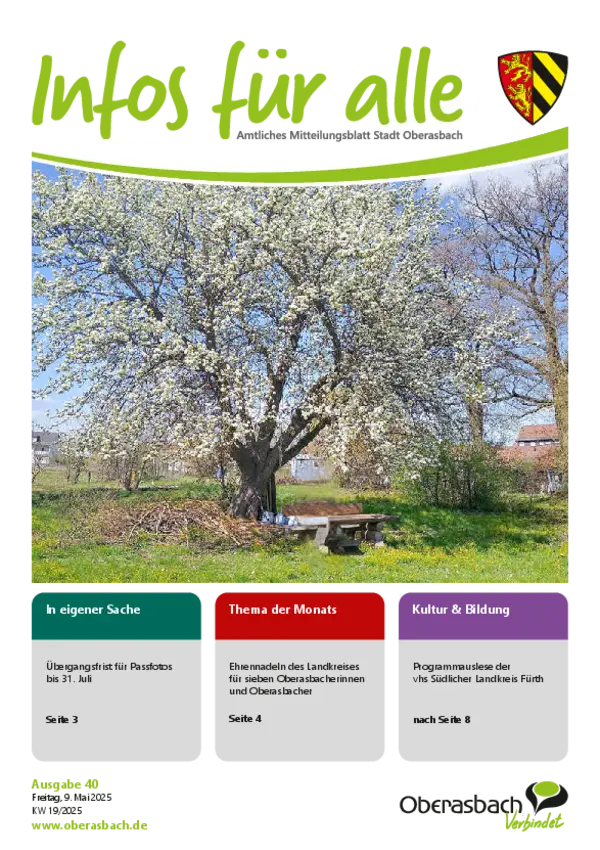 Hier finden Sie das amtliche Mitteilungsblatt der Stadt Oberasbach als PDF-Download. Die neuesten Ausgaben von "Infos für alle” stehen zudem als blätterbares E-Paper zur Verfügung.