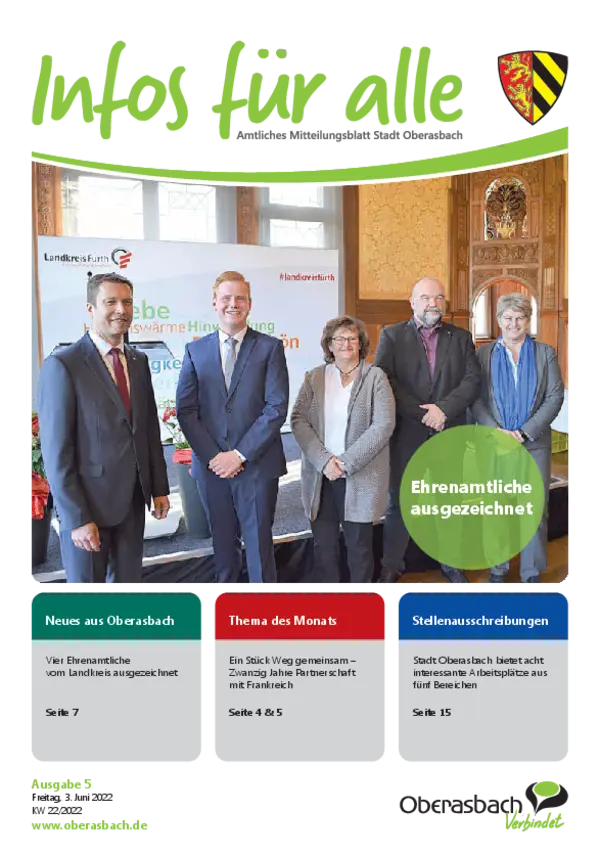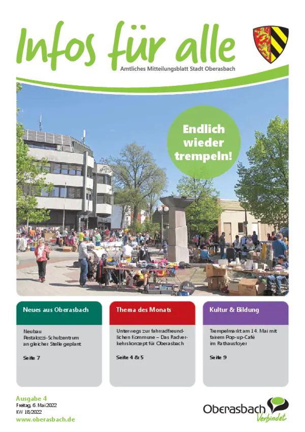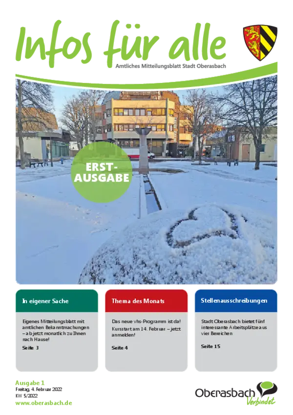 Hier finden Sie das amtliche Mitteilungsblatt der Stadt Oberasbach als PDF-Download. Die neuesten Ausgaben von "Infos für alle” stehen zudem als blätterbares E-Paper zur Verfügung.