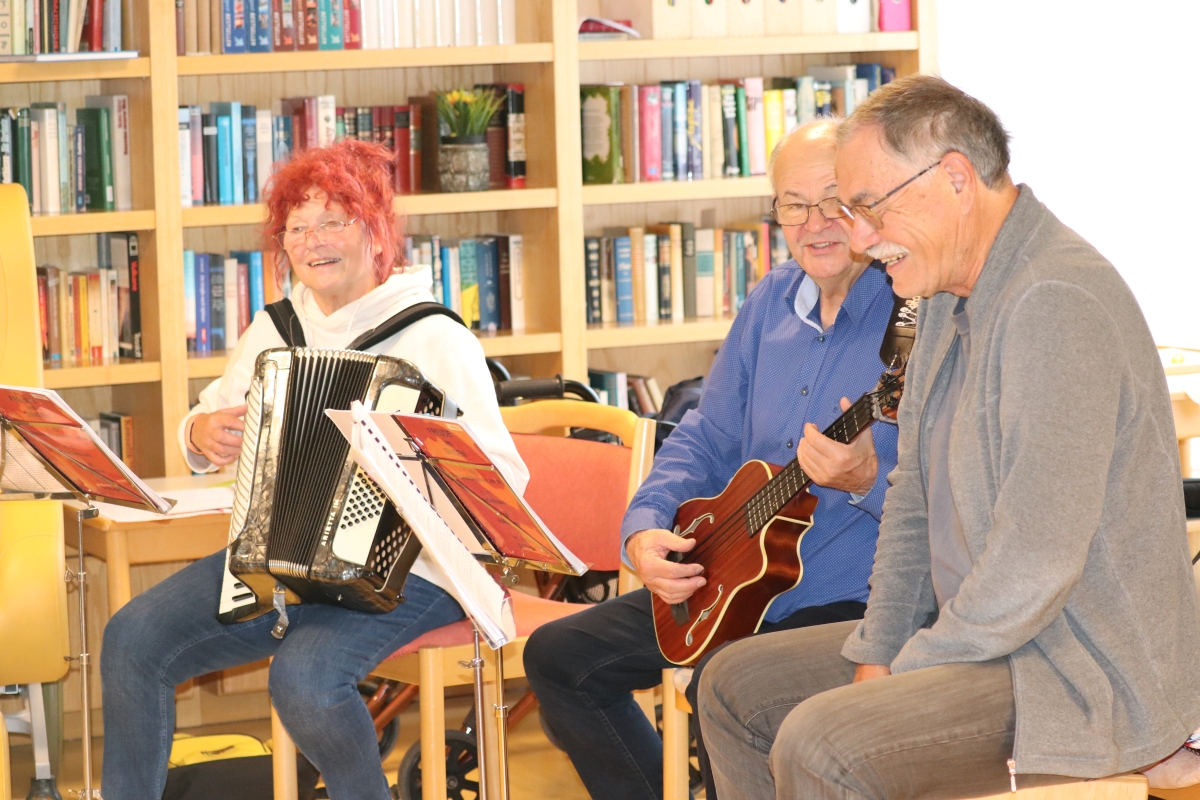 In den ersten Jahren bildete Traudi Fassel mit Rosemarie Mätzler ein Duo, seit 2021 begleitet sie ihr Mann Harald auf der Gitarre, oder Bass-Ukulele. Denn auch der gelernte Elektrotechniker, der als Musikalienfachhändler über zehn Jahre ein eigenes Geschäft hatte, hat Musik im Blut. Ob Kufsteinlied, Schneewalzer oder Lieblingslieder aus der Jugend der Heimbewohner – unglaubliche 500 Lieder haben die Fassels im Repertoire. Harald Fassel schreibt die Lieder selbst um für die eigene Stimmlage und arrangiert Potpourries. Zusammen mit den heimischen Proben benötigen die Fassels für die Aufritte pro Woche rund vier Stunden Zeit. „Es macht so viel Spaß, wenn sich die Leute freuen und mitsingen. Uns ist dieses Engagement sehr wichtig, denn da arbeitet man direkt am Menschen“, erzählt der 73-Jährige. Seit etwa sechs Monaten gesellt sich aus dem weitverzweigten Freundeskreis immer wieder auch Peter Trost zu dem musikalischen Ehepaar, um die Auftritte vor betagtem Publikum mit seiner geschulten Tenor-Stimme und einem Rhythmusinstrument (Cajon) zu bereichern.