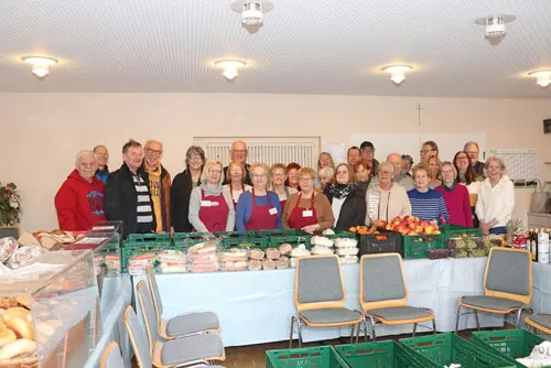 und privaten Spender! Nur durch sie ist es möglich, dass wir helfen können.Zurzeit sind es 42 ehrenamtliche aktive Helferinnen und Helfer, die in vier Teams im wöchentlichen Wechsel im Einsatz sind. An jedem Ausgabetag arbeiten zehn Personen: Vier Fahrer/Beifahrer holen die Ware von den Händlern, sechs Damen bereiten sie auf und verteilen sie an unsere Kunden. Die Einsatzzeit der Damen ist von ca. 9.00 bis 14.30 Uhr einmal im Monat, für die Fahrer eine Stunde mehr, sie beginnen um 8.00 Uhr ihre Touren. Die Organisation und Arbeitseinteilung übernehmen die beiden Teamleiter Harald Krug und Josef Winkler. Deren Arbeitsaufwand beträgt jeweils ca. 20 Stunden monatlich. Viele unserer Teammitglieder machen bei uns mit, weil ihnen neben der Hilfe für Bedürftige das Retten von Lebensmitteln wichtig ist. Es sind oft Menschen, die sich ein Leben lang ehrenamtlich engagiert haben, und das wie selbstverständlich nun auch im Rentenalter noch tun. Das Warenangebot wird von den Kunden sehr gerne und mit Freude angenommen. Auch das Engagement unsererseits und unser Umgang mit ihnen kommen sehr gut an. Es entwickeln sich neben dem Verteilen immer wieder Gespräche über private Sorgen und Nöte, aber auch freudige Erlebnisse. Man kennt sich mit der Zeit.