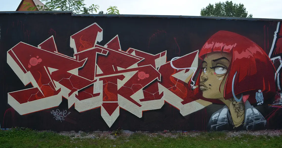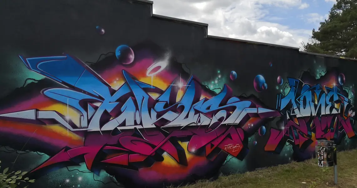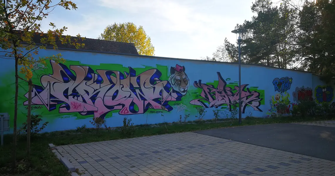 Mit dieser Wand hinter dem Jugendhaus OASIS gibt die Stadt Oberasbach allen Spray-Begeisterten die Möglichkeit sich auszuprobieren und auszudrücken. Das Ergebnis reicht von kleinen Tags bis zu teilweise großformatigen Kunstwerken, die das Stadtbild hier im „Grün für alle“ bereichern.