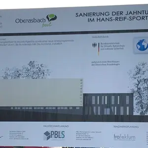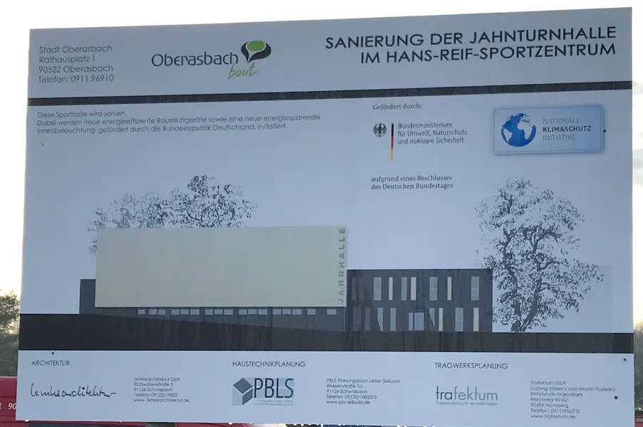 Seit Juli 2019 erfolgt die Sanierung der Jahnturnhalle im Hans-Reif-Sportzentrum. Unter anderem durch die Sanierung der Lüftungsanlage und eine moderne Innenbeleuchtung wird eine jährliche Einsparung des CO2-Ausstoßes von 60 Tonnen erreicht. "Das ist wieder ein wichtiger Schritt zur Erreichung der Klimaziele der Stadt Oberasbach", so Erste Bürgermeisterin Birgit Huber.