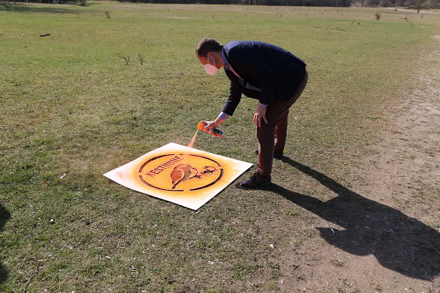 Als erster griff Landrat Matthias Dießl zur Spraydose: „Ziel der Aktion ist es, den Besuchern des Hainbergs die Bedeutung der Brutschutzzeit zu verdeutlichen, denn das unüberlegte Betreten der Flächen kann den Bruterfolg der Arten stark bedrohen. Es ist wichtig, die befestigten Wege zu dieser Zeit nicht zu verlassen und Hunde, unabhängig von der Brutzeit, ganzjährig anzuleinen.“