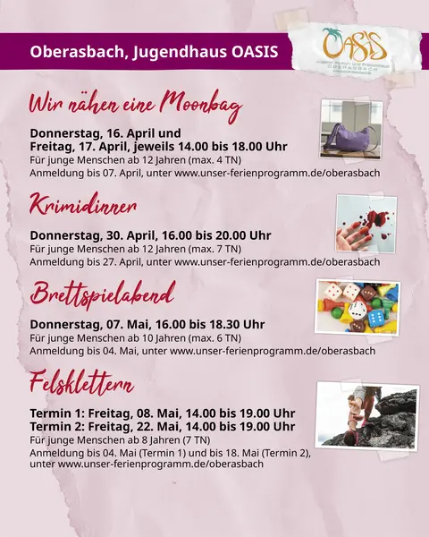 Das Programm richtet sich an alle Kinder und Jugendlichen zwischen 8 und 16 Jahren und bietet jede Menge Abwechslung zwischen den Oster- und Pfingstferien. Vom 7. April bis 22. Mai veranstaltet das Jugendhaus einen Nähworkshop, ein Krimidinner und einen Brettspielabend. Im Mai finden zwei Termine zum Felsklettern statt. Darüber hinaus beherbergt das Jugendhaus im April vier Tage lang den Escape Room “Durch Raum und Zeit”. Zusätzlich zu den Oberasbacher Angeboten können die Jugendlichen auch an Workshops und Events in Langenzenn, Veitsbronn, Cadolzburg, Puschendorf, Tuchenbach oder Stein teilnehmen. Die komplette Übersicht und Details zur Anmeldung bei den verschiedenen Jugendhäusern finden sich auf der Homepage des Jugendhaus OASIS www.jugendhaus-oasis.de.