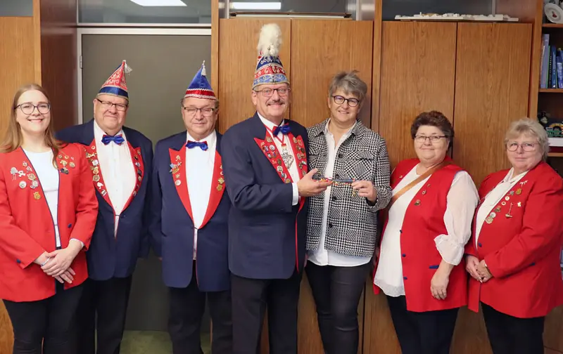 Pünktlich um 11.11 Uhr schallte es am 11. November über den Flur des Rathauses: „BLAU-ROT He-lau!“ Die Närrinnen und Narren der Karnevalsgesellschaft Blau-Rot hatten das Rathaus gestürmt und schritten zur Schlüsselübergabe ins Büro der Ersten Bürgermeisterin.