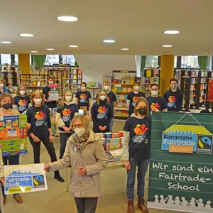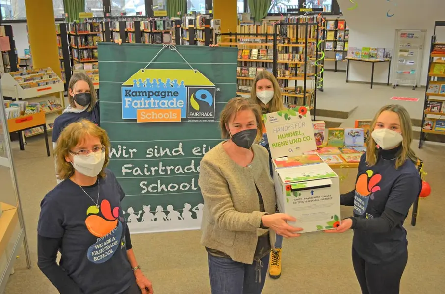 Im Rahmen des Projektseminars „Ökologie und Fairtrade“ des Ende 2021 als Fairtrade-Schule rezertifizierten Dietrich-Bonhoeffer-Gymnasiums (DBG) setzen sich zwölf Oberstufenschülerinnen und -schüler aktuell für ein Projekt von NABU (Naturschutzbund Deutschland) e.V. zum Handy-Recycling ein: Sie sorgen unter dem Motto „Handys für Hummel, Biene und Co.“ gemeinsam mit ihrer Lehrerin Christine Emmert dafür, dass ab sofort eine Handysammelbox in der Oberasbacher Stadtbücherei im UG des Rathauses steht.