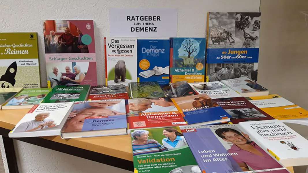 Parallel dazu gibt es eine Fülle an Informationsmaterial in einer kleinen Buchausstellung zum Thema Demenz in der Stadtbücherei. Von "Kurz&knapp"-Ratgebern über ausführliche Informationen zum Krankheitsbild und Material, das Aktivierungsmöglichkeiten der Erkrankten beinhaltet, bis hin zur belletristischen Aufarbeitung des Themas erstreckt sich das Spektrum an Büchern, die kostenfrei in der Bücherei ausgeliehen werden können.