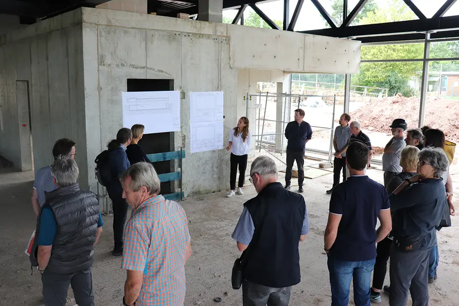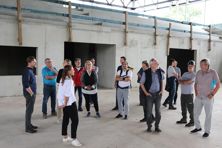 Im Rahmen eines Vor-Ort-Termins konnten sich jetzt die Mitglieder des Stadtrates und Beschäftigte der Verwaltung ein eigenes Bild vom Baufortschritt machen. Die ausführenden Architekten des Architekturbüros BBS erläuterten den aktuellen Baufortschritt bei einer Führung durch die Halle.