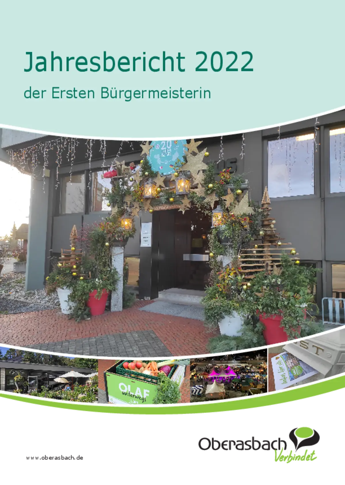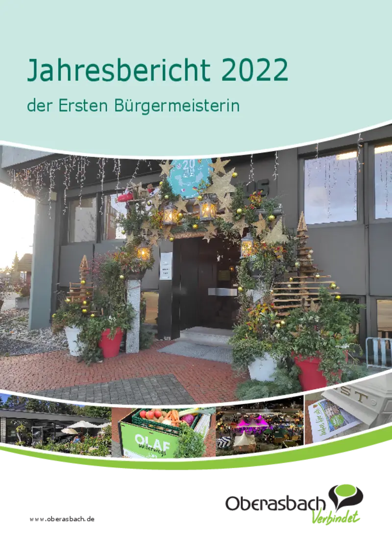 Der Jahresbericht der Ersten Bürgermeisterin gibt Auskunft über die Ereignisse in Oberasbach, Neuigkeiten aus Verwaltung und Stadtrat. Die Chronik gibt einen schnellen Überblick, der dann in den Berichten aus den einzelnen Abteilungen der Verwaltung, den Einrichtungen und Institutionen genauer erläutert wird. Nicht fehlen dürfen natürlich die Würdigung des ehrenamtlichen Engagements der Oberasbacher Bürgerinnen und Bürger, Berichte aus dem Quartiersmanagement, den Aktions- und Arbeitskreisen, den Feuerwehren, den stadtnahen Vereinen und Stiftungen sowie ein Nekrolog und die obligatorischen statistischen Daten.