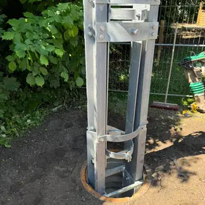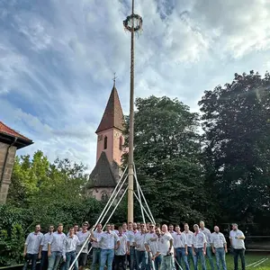 Die im Jahr 1216 geweihte evangelische Pfarrkirche St. Lorenz und rechts daneben ein Kärwabaum: So sieht seit 2004 das Logo des Kärwaboum Oberasbach e.V. aus. Jetzt lässt sich dieses Ensemble auch genau so in einem Foto verewigen, denn rechtzeitig zur Kärwa installierten die Kärwaboum einen neuen Baumständer am Rande des Kindergarten-Spielplatzes. „Wir sind sehr stolz darauf, dass unser Logo zum 20-jährigen Jubiläum des Vereins nun endlich der Realität entspricht!“, freuen sich 1. Vorstand René Schuster, seine Vorstandsmitglieder und die gesamten Kärwaboum. Für die ca. 1,50m aus dem Boden ragende Stahlhalterung musste ein in zwei Metern Tiefe eingelassenes Betonfundament gegossen werden. Die Erd- sowie die Betonierarbeiten wurden von zwei ortsansässigen Firmen übernommen. Auf ihrer Facebook- und Instagram-Seite ließen die Kärwaboum mit einer kleinen Baudokumentation rätseln, woran sie da wohl werkeln. „Wird eine stationäre Zapfanlage – für den Boxenstopp zwischendurch“, so ein launiger Kommentar.