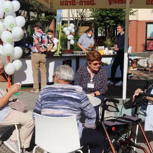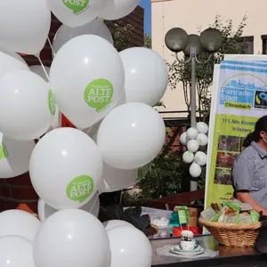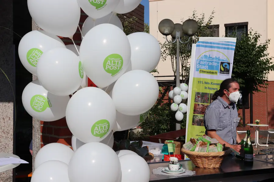 Zur Einweihungsfeier bot der Aktionskreis Fairtrade fair gehandelten Kaffee und faire Limo an. Brezeln und süße Teilchen wurden Corona konform einzeln verpackt an die Gäste ausgegeben. Die aufgebauten Sitzgelegenheiten und zusätzlich aufgestellten Stehtische vor dem Gebäude wurden ausgiebig genutzt und sorgten für einen guten Gesprächsaustausch.