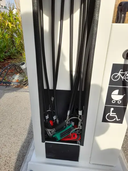 Über den an der Säule angebrachten QR-Code erhält man kurze Bedienungs- und Reparaturanleitungen. Die Standluftpumpe kann selbstverständlich auch für Rollstühle oder Kinderwägen verwendet werden.