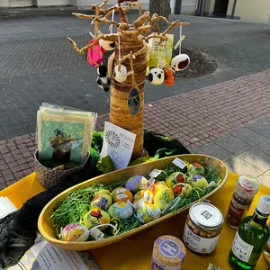 Auch Anni Hödl und Hanni Unbehauen vom Weltladen St. Markus zeigen eine große Bandbreite fair gehandelter Produkte, das von Weinen, über leckere Pestos, vielfältige GEPA-Schokoladen, einer weiten Kaffee- und Teeauswahl bis hin zu getrockneten Früchten reicht. „Neben unseren Schoko-Ostereiern haben wir zur Osterzeit auch bunt bemalte Deko-Ostereier im Angebot“, ergänzte Anni Hödl.