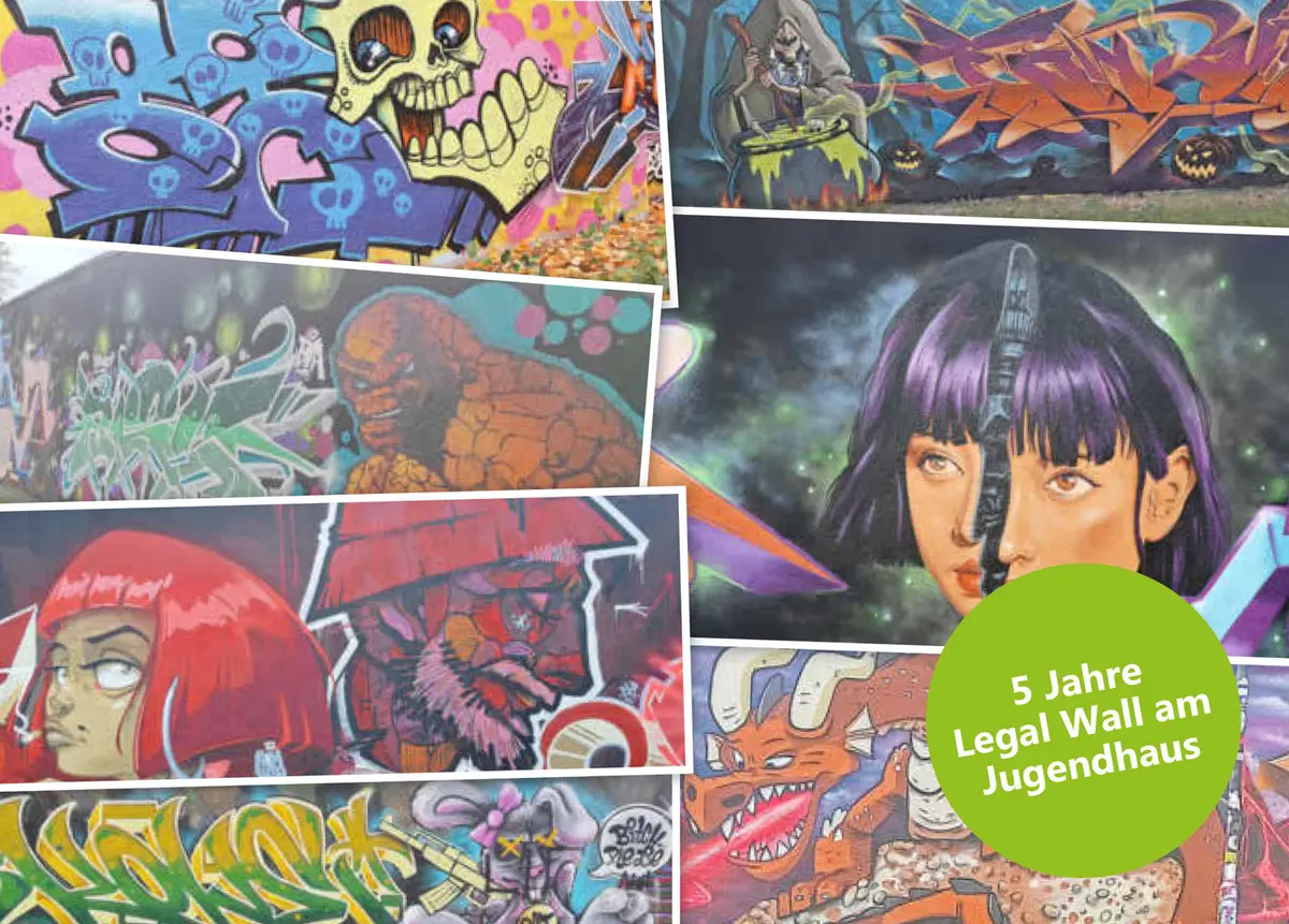 Die Legal Wall am Oberasbacher Jugendhaus wurde am 6. Oktober 2023 fünf Jahre alt. Die von der Stadt Oberasbach "Freigegebene Fläche für Graffiti-Kunst" am OASIS erfreut sich in der Sprayer-Szene großer Beliebtheit und wird immer wieder neu gestaltet.