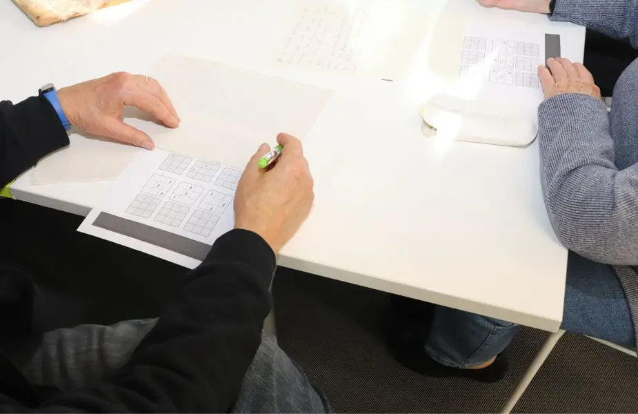 „Ich hab alles richtig“, freute sich eine Teilnehmerin, nachdem sie sich Zahlenmuster eingeprägt und aus dem Gedächtnis zu Papier gebracht hatte. Andere waren gut darin, für jeden Buchstaben des Alphabets Namen à la Stadt-Land-Fluss zu notieren. Die Finger-Koordinationsübungen fingen auf leichtem Niveau an, forderten in den nächsten Stufen aber auch die Jüngeren heraus.