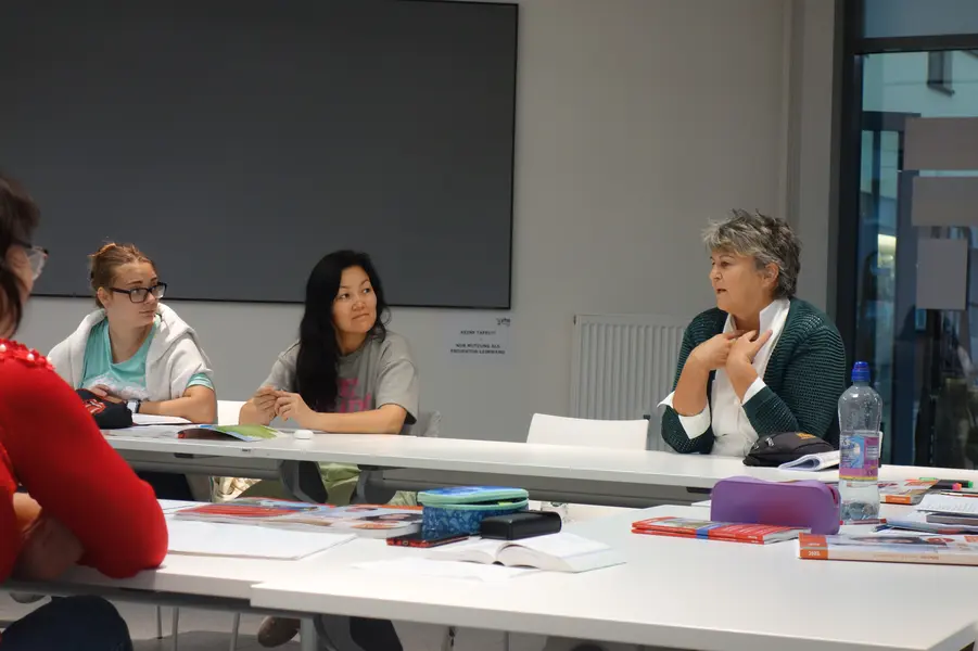 Im Sitzungssaal ging es zum die regelmäßigen Treffen des Stadtrates. Jeden Montag finden dort entweder Sitzungen des Stadtrates oder seiner Ausschüsse (z.B. Hauptverwaltungsausschuss oder Umwelt-, Bau- und Grundstücksausschuss) statt, um dort aktuelle Anliegen zu diskutieren und Entscheidungen zu treffen. Die Besucherinnen äußerten großes Interesse daran, an den öffentlichen Sitzung teilnehmen zu können.