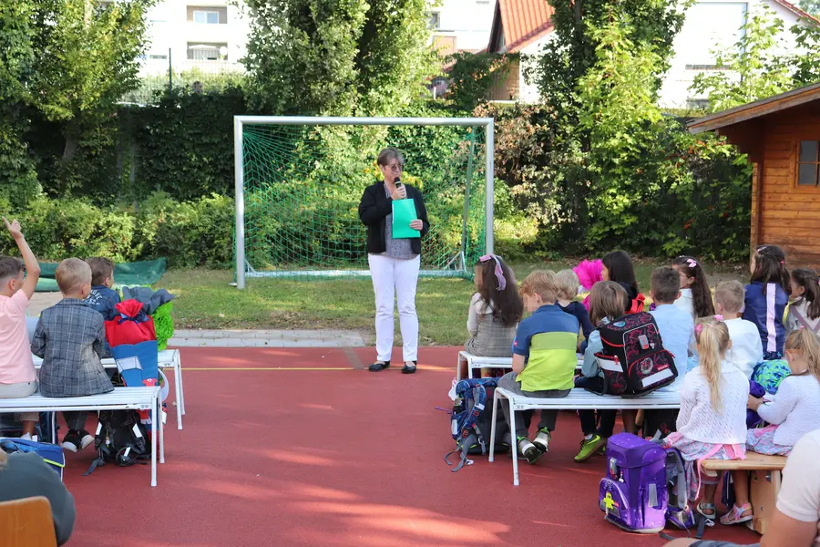 Schulleiterin Gabriele Eitel und Schüler:innen der zweiten Klassen empfingen sie herzlich. Die Mitschüler:innen erklärten in Liedern und Gedichten, auf was sich die neuen Schüler:innen freuen können. Die Schulleiterin fragte die Erwartungen ab und stellte die jeweiligen Klassenleitungen vor.