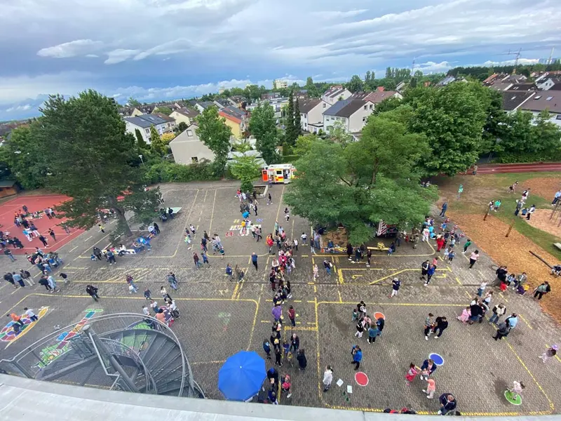 In einer Kunstprojektwoche hatten die Schülerinnen und Schüler ihren Pausenhof mit Unterstützung der Künstlerin Sabine Schwarz, die es sich nicht nehmen ließ, am Schulfest persönlich vorbeizuschauen, bunt gestaltet. Rechtzeitig kam die Sonne heraus und Eltern und andere Gäste konnten sich im Pausenhof die Kunstwerke anschauen. Vom Förderverein gesponserte vielfältige Spielgeräte waren aufgebaut und wurden ebenso wie die neu aufgemalten Hüpfspiele eifrig bespielt.