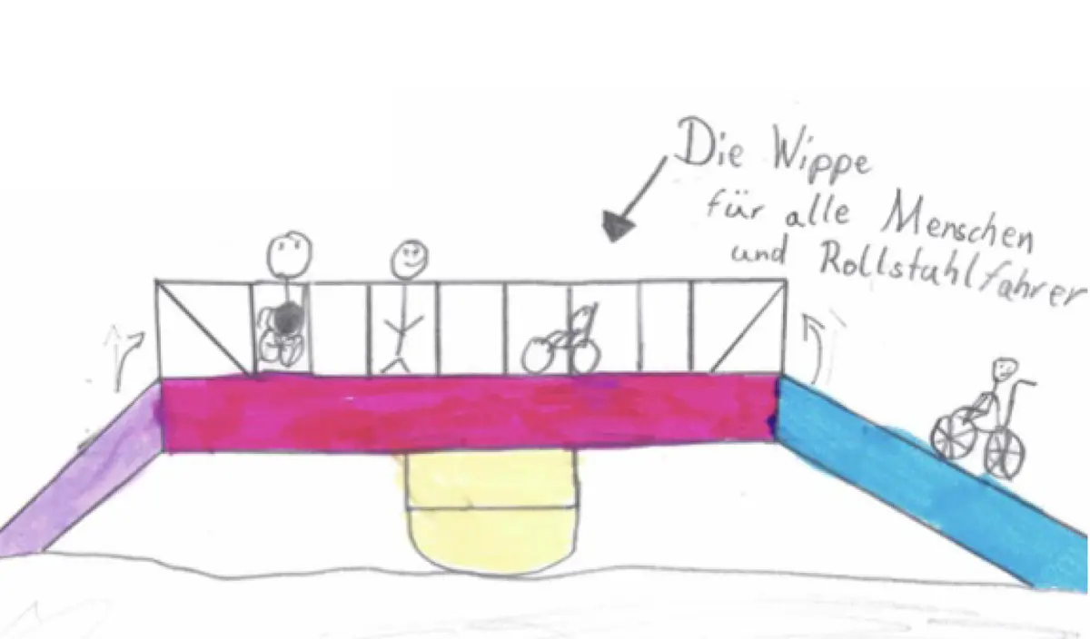 In der Ausschreibung, die sich an alle Grund- und Förderschulen in Deutschland richtete und zu kreativem Einfallsreichtum aufrief, stand das Thema „Aktivität und Bewegung“ im Mittelpunkt. Nachdem sich das Kollegium zu einer Teilnahme entschieden hatte und eine zur Schulsituation passende Konzeption entwickelt hat, durften die Schülerinnen und Schüler ihre Ideen einbringen. Bei „Gemeinsam Schule gestalten“-Treffen (GSG) berieten die Kreutleser Pestalo-Schüler, welche Bewegungsstationen sie sinnvoll finden – sie sollen sich vielfältig bewältigen lassen und ein inklusives Miteinander auch für Menschen mit Beeinträchtigungen erlauben. Die Kinder malten Bilder, bauten Modelle und einigten sich schließlich auf einen Fitnessparcours mit einzelnen Elementen zum Hangeln und Befahren, ein Artistikseil, an dem sich Rollstuhlfahrer mit den Armen entlang ziehen können, eine befahrbare Wipp-Plattform mit Halteseil („Menschenwippe“), ein Bodentrampolin, ein Reck, einen Barren und einen Barfußparcours, bei dem Kinder im Rollstuhl Führungshilfe für die anderen sind. Auch eine Elternbeteiligung über Fragebögen gab es.