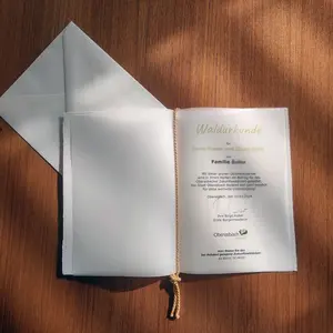 Für Ihre Spende erhalten Sie auf Wunsch eine Urkunde zum Verschenken mit Unterschrift der Ersten Bürgermeisterin, die Sie z.B. zu einem Geburtstag, einem Ehejubiläum oder auch einer Geburt überreichen können. Die "Waldurkunde" liegt in einer hochwertigen DIN A5-Klappkarte aus weißem Büttenpapier mit geprägtem Stadtwappen auf der Vorderseite, dazu gibt es einen passenden gefütterten Umschlag.