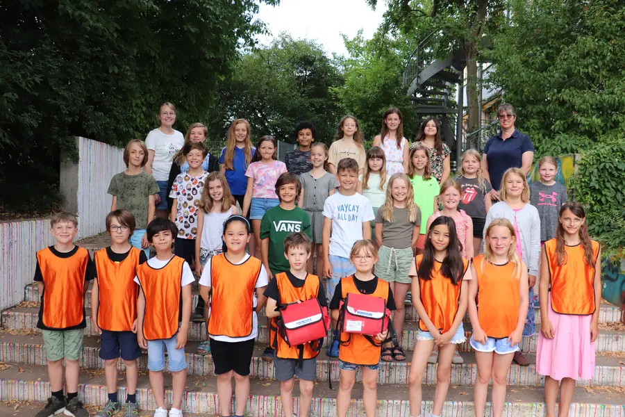 Svenja, Emilia, Theo und Jona engagieren sich in der Grundschule Altenberg (GSA) als Schulsanitäter:innen. Die Ausbildung beginnt jeweils in der 3. Klasse. „Wir haben damals an einem Lehrgang teilgenommen“, erinnert sich Theo. „Dabei haben wir gelernt, die Pflaster richtig aufzukleben, wie man die stabile Seitenlage macht und was man bei einer stark blutenden Wunde tun soll.“ Ab der 4. Klasse sind sie dann in Zweiergruppen gut erkennbar an orangen Westen in den Pausen unterwegs.