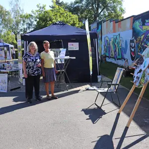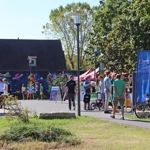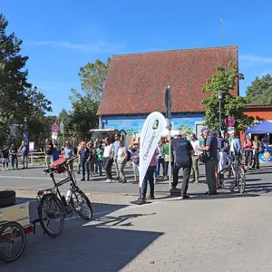 Der Aktionskreis Fairtrade informierte umfassend über fairen Handel und lockte die Gäste mit Glücksrad-Gewinnen, der Stand des Weltladens Oberasbach bot eine große Auswahl an fair gehandelten Produkten. Der Bund Naturschutz und die Hofladenbox teilten ihr Wissen über Naturschutz und regionale Ernährung, u.a. über Mitmachaktionen. Am Stand des ADFC hatte man die Möglichkeit, das Oberasbacher Lastenrad OLAF zu testen und Fragen zum Thema Radverkehr zu diskutieren. In der Fahrradnachbarschaftswerkstatt und im Repair Café konnte man derweil defekte Fahrräder und Geräte wieder flott machen und somit natürliche Ressourcen schonen. Zudem lud einer ihrer ehrenamtliche „Piloten“ zu kleinen Probefahrten mit der neuen städtischen E-Rikscha ERIKA ein. Der Landkreis Fürth, Kooperationspartner der Veranstaltung, war ebenfalls mit einem Informationsstand vertreten: Ramona Pfahler, Klimaschutzmanagerin des Landkreises Fürth, und Monika Hübner, zuständig für Wirtschaftsförderung, Regionalmanagement und Nachhaltigkeit, hatten Einblicke in das Solarpotenzialkataster, das Gründachtkataster und die nachhaltigen Entwicklungsziele (SDGs) im Gepäck.
