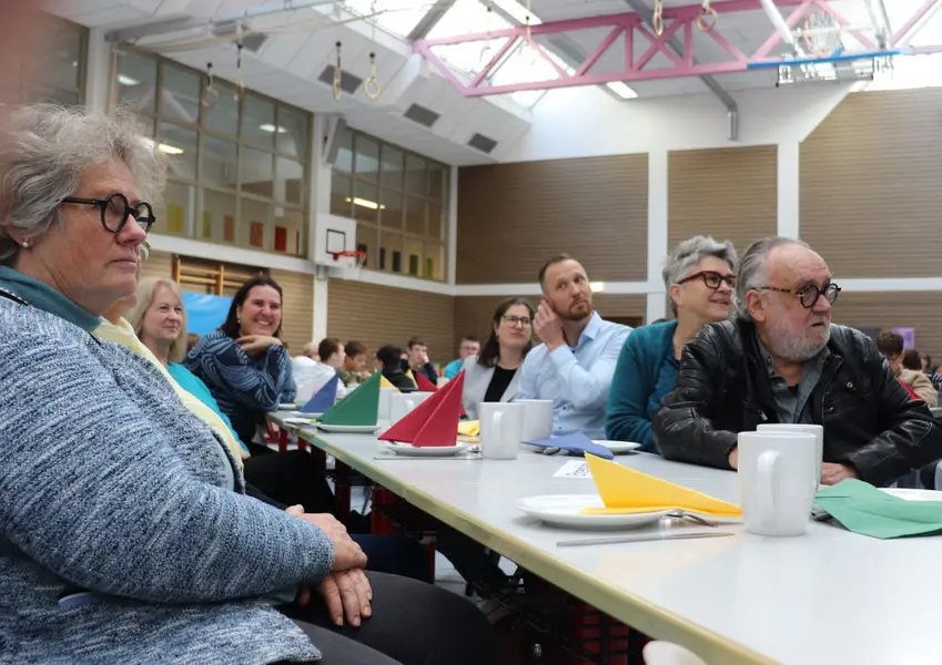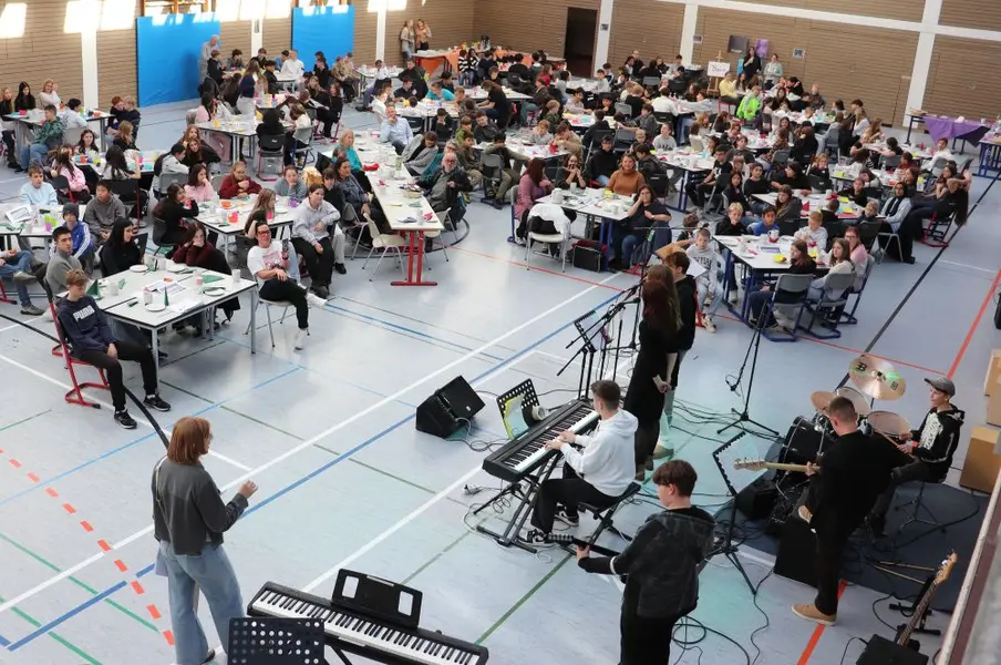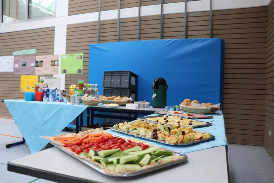 Rund 300 Frühstücksfans versammelten sich am 30. Oktober in der Turnhalle des Pestalozzi-Schulzentrums. Gastgebende waren neben Konrektor Jens Gütlein alle Schülerinnen und Schüler der Mittelschule. Speziell die 6. Klassen, die im Mittelpunkt der Projektwoche ihre Alltagskompetenzen zum Thema Ernährung ausbauten, hatten das Buffet mit leckeren und gesunden Zutaten wie Obstspießen und Gemüsesticks bestückt, die Tische aufgebaut und liebevoll dekoriert.