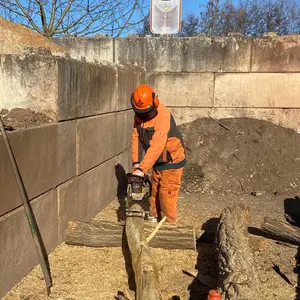 Akazienholz hat ähnlich hervorragende technische Eigenschaften wie das oft auf Spielplätzen eingesetzte Holz der Robinie: Es ist hart, belastbar, fasert nicht, ist witterungsbeständig und hat einen natürlichen Schutz vor Insekten und Pilzen. Um die Stämme entrinden zu können, hat der Bauhof für die hauseigene Schreinerei einen Spezialaufsatz für die Säge angeschafft – für die viel Kraft erfordernde Handhabung war eine zusätzliche Schulung nötig: „Etwa eine Stunde benötigt man zum Schälen, danach muss der Stamm noch poliert werden. Aber das lohnt sich: Ein vergleichbares, vier Meter langes Robinien-Rundholz mit ca. zwanzig Zentimetern Durchmesser kostet im Fachhandel etwa 350 Euro“, erläutert Bernd Brodwolf vom Bauhof bei seinem Einsatz auf dem Spielplatz. Und weiter: „Wir haben etliche solcher Akazienhölzer im Bauhof eingelagert, darunter auch eine Akazie mit 50 Zentimetern Durchmesser.“