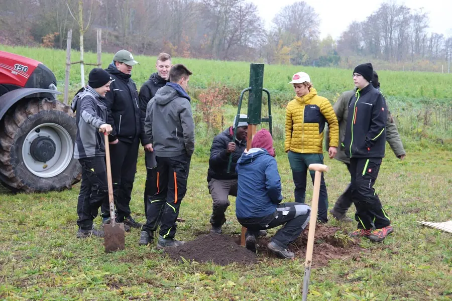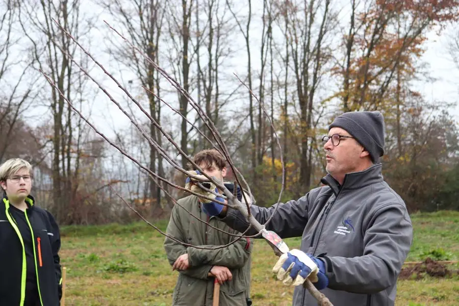 Im Rahmen des Aktionstages lernten die Schüler Details vom Pflanzlochgraben über das Zuschneiden der Wurzeln, das richtige Pflanzen und Anbinden bis zum Pflanzschnitt der Baumkrone und die richtige Versorgung der Baumscheibe. Dabei unterstützten Mitarbeiter des LPV und zertifizierte Obstbaumwarte.