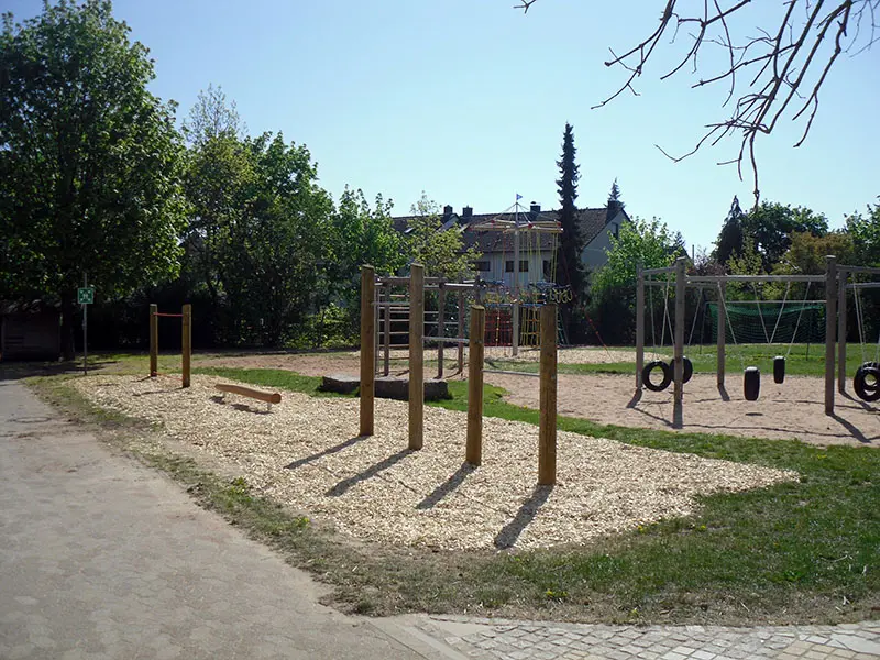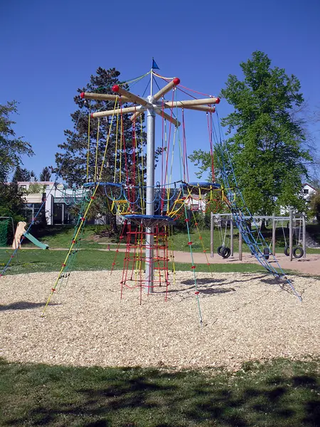 Als Belag für den Fallschutzbereich wählte man Hackschnitzel, da der bisherige Sand gerade bei Feuchtigkeit an den Schuhen der Kinder ins ganze Schulhaus getragen wurde.