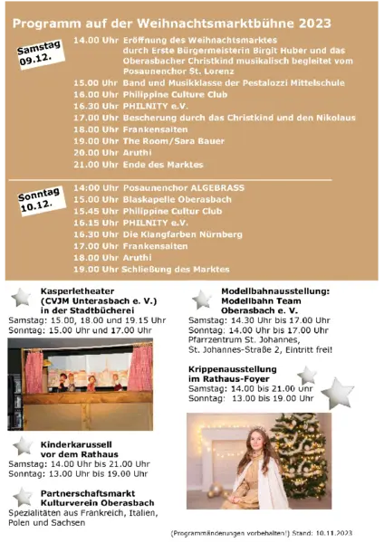 Bürgermeisterin Birgit Huber eröffnet den Markt am Samstag um 14 Uhr gemeinsam mit dem neuen Oberasbacher Christkind und Vertretern der Partnerstädte. Die große Bescherung ist dann am Samstag um 17 Uhr auf der Weihnachtsmarktbühne.