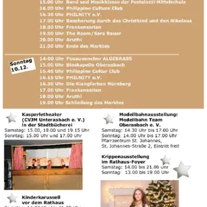 Adventszeit ist Familienzeit. Das ist auch in Oberasbach nicht anders. Für die kleinen Besucher führt der CVJM Unterasbach wieder ein Kasperletheater in der Stadtbücherei auf. Vorstellungen sind am Samstag um 15 Uhr, 18 Uhr und 19.15 Uhr, sowie am Sonntag um 15 Uhr und 17 Uhr. Der Kindergarten Regenbogen bietet am Weihnachtsmarktwochenende eine Lebkuchenwerkstatt an und ein Kinderkarussell steht direkt vor dem Rathaus.
