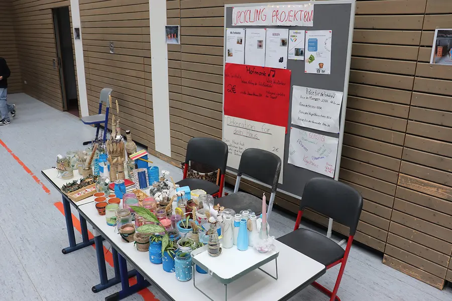 Die Schülerinnen und Schüler stellten das Spektrum kurz vor. Es reichte in den Klassen 5 bis 7 von „Thema Oberasbach“ (mit Besuchen des Wallensteinweges und der St. Lorenz Kirche) über „Grundlegendes“ (Besuche des Erlebnisbauernhofes Engelhardt in Egersdorf oder der Straße der Menschenrechte) bis hin zum Thema „Cyber-Mobbing“ mit Referaten, einem Expertenbesuch und Lehrerschulung. Die Klassen 8 bis 10 beschäftigten sich mit den Themen „Nachhaltigkeit“ (Vermeidung von Plastikverpackungen und Upcycling), „Berufliche Zukunft“ und „Klimaschutz“. Im Hinblick auf ihre berufliche Zukunft besuchten die Schülerinnen und Schüler die Produktion der Firma Faber-Castell in Stein, einen Optiker sowie eine Gärtnerei und waren darüber hinaus mit dem Karrierebus des Landkreises unterwegs. Dabei begleitete sie auch die Beauftragte für Wirtschaftsförderung und Regionalmanagement der Stadt Oberasbach, Michaela Heckel.