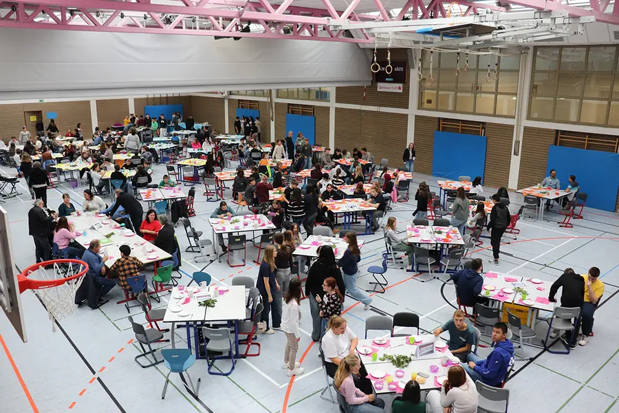 Kurz vor den Herbstferien trafen sich alle Schüler der Pestalozzi-Mittelschule Oberasbach zum traditionellen Schulfrühstück in der Sporthalle. Es bildete am 24. Oktober den Abschluss einer Projektwoche, in der sich die rund 200 Schülerinnen und Schüler jahrgangsweise vielfältigen Themen gewidmet haben.