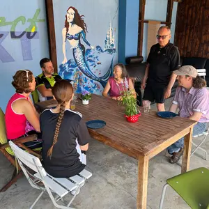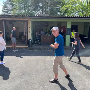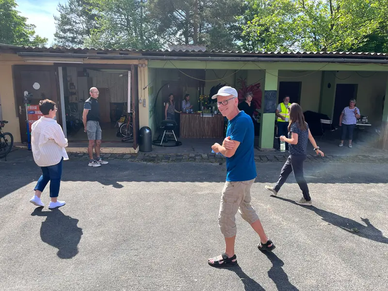 Nach der kurzweiligen Rast ging es auf zum Endspurt. In Vorfreude auf eine kleine Stärkung fuhr die Gruppe entlang des Asbachgrundes zum Ziel der Tour, dem Jugendhaus OASIS, wo die Gruppe von den engagierten Mitarbeiterinnen des Jugendhauses mit kalten Getränken, fair gehandeltem Kaffee, Kuchen und regionalem Eis empfangen wurde. Während die einen von den zuständigen Ehrenamtlichen vor Ort Einblicke in die Fahrrad-Nachbarschaftswerkstatt bekamen, saßen die anderen gemütlich zusammen und ließen den Nachmittag entspannt ausklingen.