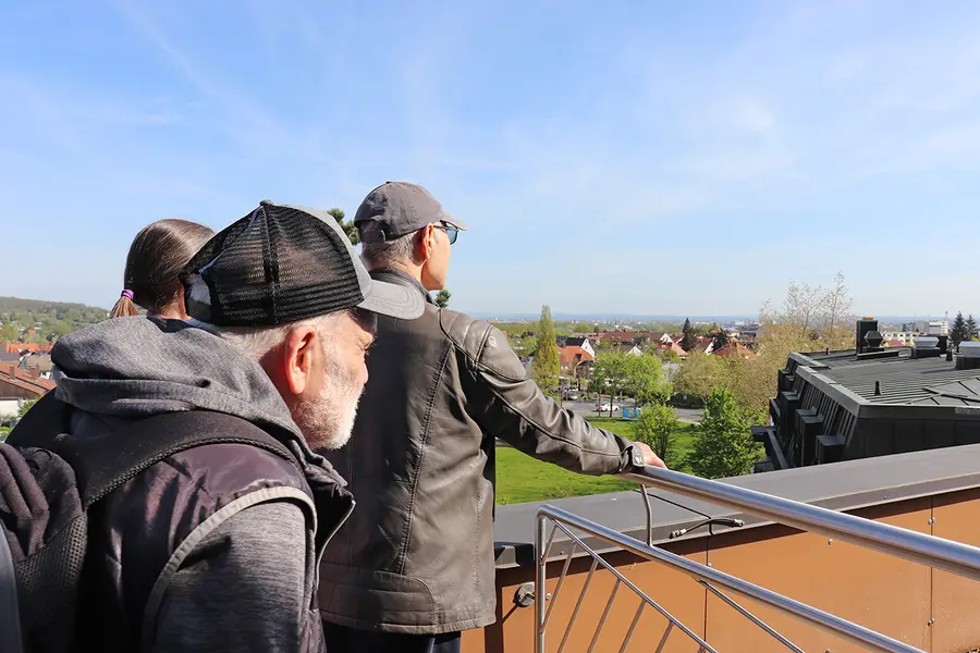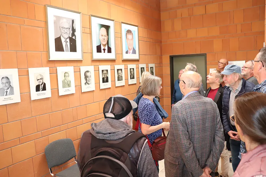 Die Teilnehmer der Führung hatten dann im 3. Obergeschoss Gelegenheit, bei strahlendem Sonnenschein den fabelhaften Weitblick von einer der Sitzungssaal-Terrassen zu genießen, von der aus man u.a. die Alte Veste in Zirndorf und die Nürnberger Burg sehen kann. Vor dem Sitzungssaal ließ sich noch die Portraitgalerie aller ehemaligen Oberasbacher Bürgermeister bestaunen, bevor es in den hauptsächlich vom Bauamt genutzten zweiten Stock ging. Beim Rundgang vorbei an den Büros machte der Chef der Hauptverwaltung – der sich seit Jahren mit Plänen für eine Sanierung, Erweiterung oder Auslagerung des Rathauses beschäftigt – deutlich, dass die Oberasbacher Schaltzentrale baulich in keinem guten Zustand sei. Im ersten Stock seien das Noch-Trauzimmer und der Serverraum die einzigen klimatisierten Räume im Rathaus. Dann ging es ins Allerheiligste, das Büro der Ersten Bürgermeisterin Birgit Huber – ihr Schreibtisch wie auch das sonstige imposante Mobiliar stammen noch aus der Zeit des ersten Hausherrn Hans Raab.