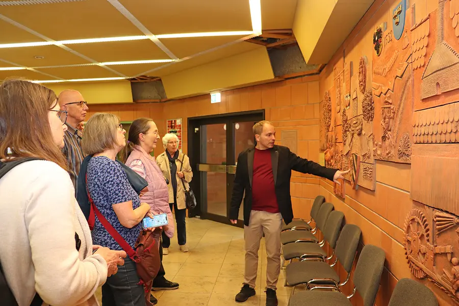 Als kleine Challenge hatte Markus Träger den interessierten Zuhörern zu Beginn mit auf den Weg gegeben, den Grundstein des Rathauses zu suchen. Doch im Untergeschoss hielt man danach vergeblich Ausschau. Die Auflösung kam im Foyer: Denn da die Grundsteinlegung am 13. September 1978 und damit drei Monate nach Baubeginn gefeiert wurde, ist der Grundstein dort eingelassen, auf Augenhöhe links vom Südeingang. Wie allgemein üblich, wurden hier ein damals aktueller Münzsatz und eine Tageszeitung sowie eine Urkunde eingemauert, deren Abschrift auf der gegenüberliegenden Seite hängt. Zum Abschluss der rund 90-minütigen Führung ging Markus Träger noch auf das großflächige Tonrelief zur Oberasbacher Geschichte bis zur Stadterhebung 1994 ein, das die Foyerwand gegenüber der Rathauspforte schmückt und das im April 2024 ebenfalls 30 Jahre alt wurde (mehr dazu im separaten Beitrag Geschichtslektion aus Ton). „Jetzt bin ich schon so oft hier hereingegangen, aber das ist mir noch nie aufgefallen!“, rief eine Teilnehmerin erstaunt aus.