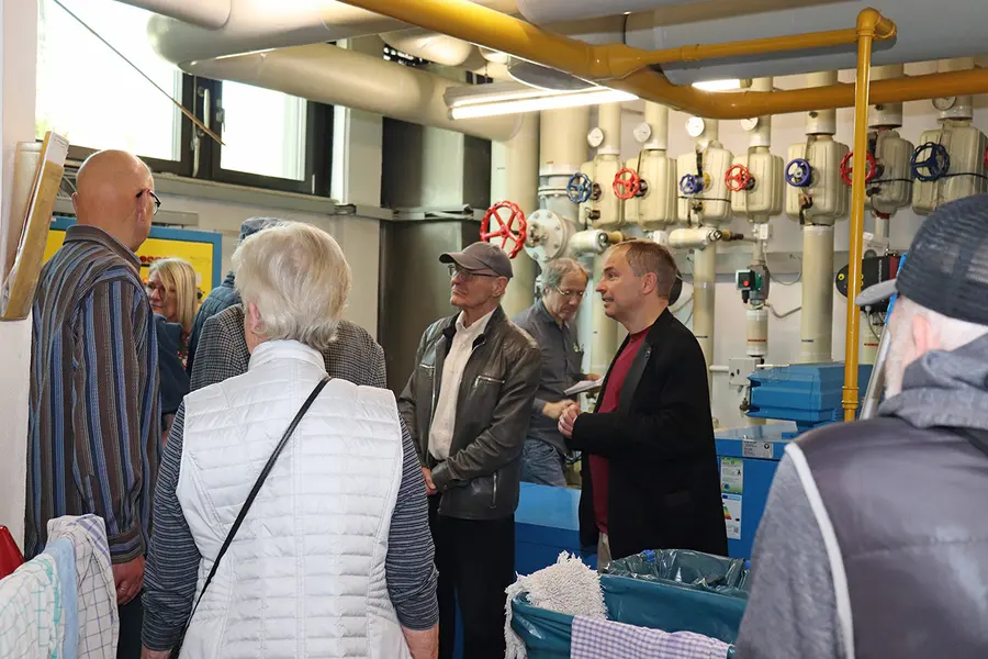 Die im ganzen Gebäude von der Decke herabhängenden Kabel erklärte Träger mit der zentralen Brandmeldeanlage, die demnächst installiert werden soll – tatsächlich funktioniere bislang die Alarmierung bei Feuer „sehr nachhaltig, aber auch sehr gesundheitsschädlich“ mit einer handbetriebenen Kurbelsirene. Im Brandfall müssten die Rathausmitarbeiter über die Fenster mittels Feuerwehr-Drehleiter evakuiert werden, sollte das einzige Treppenhaus nicht mehr passierbar sein. Mittlerweile war die Gruppe im Keller angekommen. Nach einem Blick in den Heizungskeller, den Elektroraum, den Aufzugsbetriebsraum und das Hebewerk ging es in die Stadtbücherei. „Oberasbach hat kein Geld für eine neue Bücherei – auch nicht für die zuletzt angedachte Idee einer Modulbauweise auf der sogenannten Festwiese hier am Rathaus“, verriet Markus Träger bedauernd. „Dabei entspricht sie längst nicht mehr den Vorgaben des Büchereifachverbandes – moderne Konzepte, z.B. ein angeschlossenes Café, lassen sich hier nicht umsetzen.“