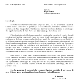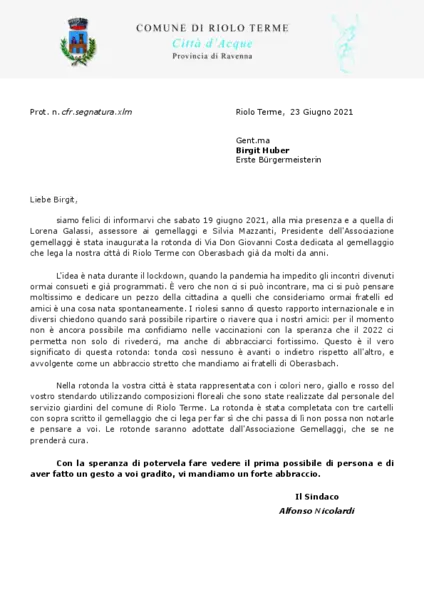 Wie Alfonso Nicolardi in seinem persönlichen Brief an die Erste Bürgermeisterin Birgit Huber schreibt, entstand die Idee entstand während des Lockdowns, als die Pandemie die üblichen und bereits geplanten Treffen verhinderte. "Es stimmt, dass man sich nicht treffen kann", so Alfonso Nicolardi, "aber man kann denen, die wir heute als Brüder und Freunde bezeichnen, ein Stück unserer Stadt widmen." Die Menschen in Riolo Terme wissen von den internationalen Städtefreundschaften und einige fragten, wann es möglich sei, unsere Freunde wiederzusehen. Auch wenn das im Moment noch nicht möglich sei, so vertrauten Sie aber auf die Impfkampagnen in der Hoffnung, dass wir 2022 uns nicht nur wiedersehen können, sondern uns auch fest in die Arme schließen dürfen.