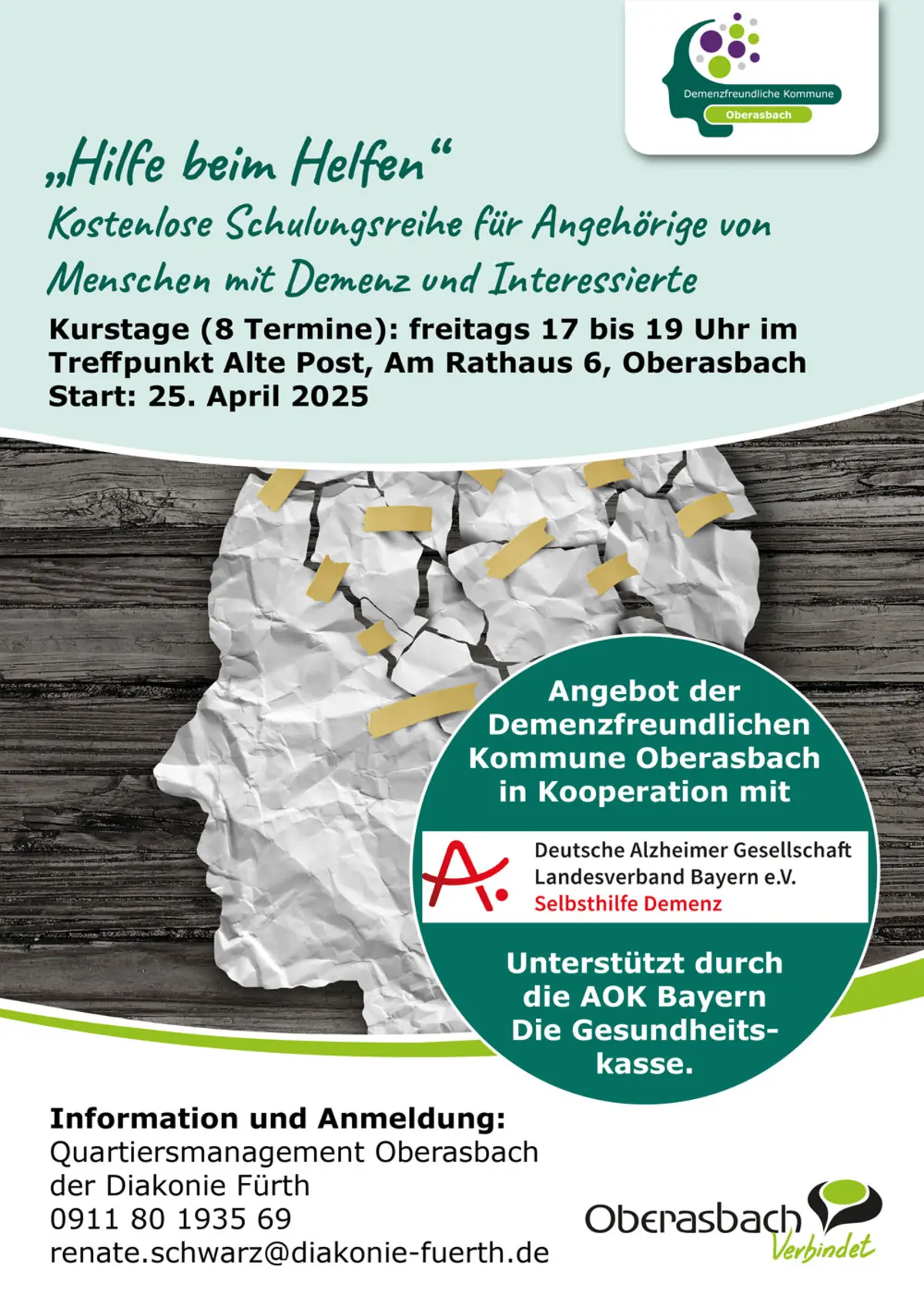 Kostenlose Schulungsreihe für Angehörige von Menschen mit Demenz und Interessierte. Ein Angebot der Demenzfreundlichen Kommune Oberasbach in Kooperation mit der Deutschen Alzheimergesellschaft Landesverband Bayern / Selbsthilfe Demenz und mit Unterstützung durch die AOK Bayern – Die Gesundheitskasse sowie Quartiersmanagement Oberasbach der Diakonie Fürth.