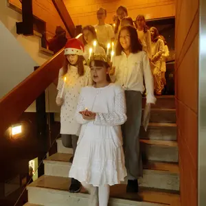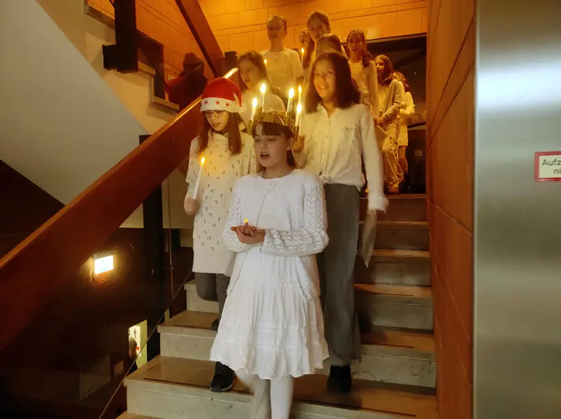 Am 13. Dezember wird in Schweden der Lucia-Tag gefeiert, mit traditionellem Gebäck und sogenannten Lucia-Zügen: Die heilige Lucia und ihr Gefolge gehen herum und singen Lieder. Während der darauffolgenden Geschichte von den Weihnachtswichteln waren deshalb vor der Tür der Stadtbücherei erste Klänge zu hören: Mit einer leuchtenden Kerzenkrone (LED natürlich) auf dem Kopf kam Lucia mit ihrem Chor und sang neben dem traditionellen Lucia-Lied auch einige bekannte Weihnachtslieder – das Highlight der Veranstaltung! Für diesen Einsatz möchten wir von ganzem Herzen Felicitas Deichmann und ihrer Chorklasse 5ac des Dietrich-Bonhoeffer-Gymnasiums danken!