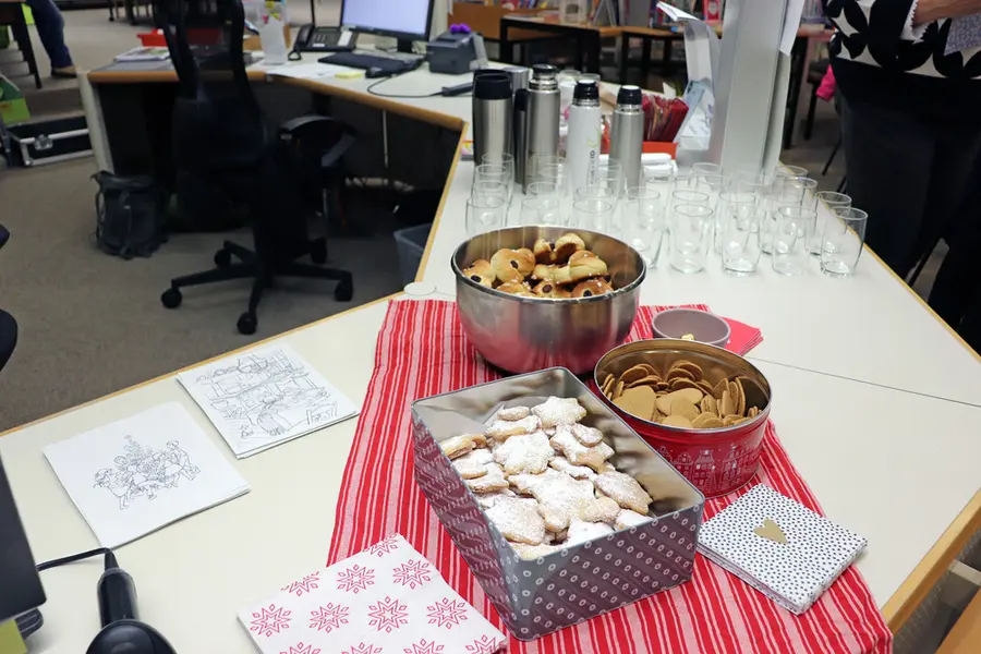 Die ca. 60 großen und kleinen Gäste machten es sich auf Stühlen und Sitzkissen bequem und naschten vom Büchereiteam selbstgebackene Plätzchen, während die stellvertretende Leiterin Cláudia Hendrych „Weihnachten in Bullerbü“ vorlas. Gleich zu Beginn durften die Kinder an einem Ratespiel teilnehmen: Genau wie die Bewohner von Bullerbü sollten sie die Anzahl einiger in einem Glas befindlichen Trockenerbsen raten. Diejenigen drei Kinder, die am nächsten dran waren, bekamen einen kleinen Preis. Im Anschluss fand eine kleine Tanzrunde um den extra dafür in der Bücherei aufgestellten Weihnachtsbaum statt – typisch schwedisch. Dann war Plätzchennachschubholen angesagt und weiter ging es mit einer kurzen Weihnachtsgeschichte von Pippi Langstrumpf.