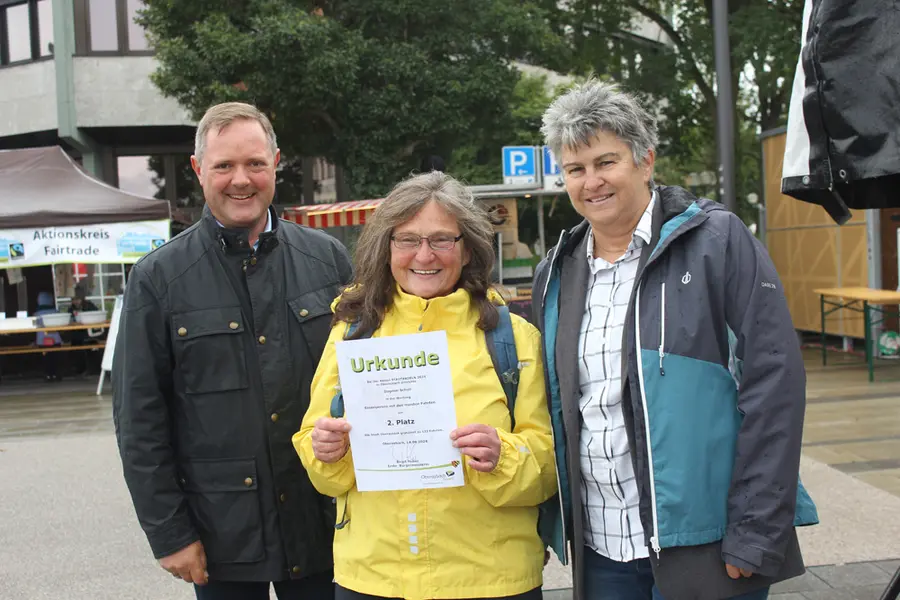 Im Rahmen des Energie- und Nachhaltigkeitstags fand am 14. September auf dem OberasbacherRathausplatz die Siegerehrung statt. „Herzlichen Dank für Ihre engagierte Teilnahme und diese großartige Leistung! Ihr Einsatz hat nicht nur geholfen, unsere Umwelt zu entlasten und das Bewusstsein für nachhaltige Mobilität zu stärken, sondern auch gezeigt, wieviel Freude das Fahrradfahren bereiten kann“, so Birgit Huber. Die Erste Bürgermeisterin überreichte zusammen mit Landrat Bernd Obst Urkunden jeweils an die drei besten Einzelpersonen und drei besten Teams in den Kategorien „meiste gefahrene Kilometer“ und „höchste Anzahl an Fahrten“.