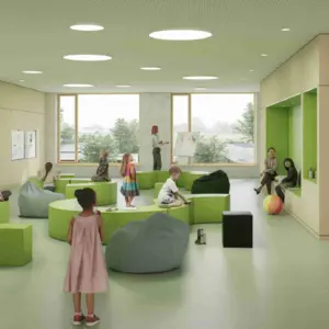 Im städtischen Pestalozzi-Schulzentrum soll auf der bisherigen Fläche des Hartplatzes, des Lehrerparkplatzes und des Hausmeisterhauses an der Schulstraße eine neue vierzügige Grundschule sowie eine Mittagsbetreuung für 200 Kinder entstehen. Die Umsetzung ist in zwei Bauabschnitten vorgesehen: zuerst Mitti bis Ende 2027, dann Grundschule. Der zweigeschossige Neubau der Mittagsbetreuung liegt im Westen, die dreigeschossige Grundschule im östlichen Teil des Baufeldes. Die bisherige Grundschule ist zu klein und für eine zukunftsgerichtete Nutzung nicht sanierbar, die Bausubstanz entspricht nicht den Anforderungen an moderne Bildungseinrichtungen. Große Defizite gibt es im Hinblick auf Barrierefreiheit und Brandschutz. „Die gemeinsame Planung ist notwendig, da sich im Gebäude der Mittagsbetreuung gemeinsame Wirtschafts- und Technikräume sowie Flächen befinden, die fördertechnisch der Grundschule zuzuordnen sind. Außerdem kann nur so die spätere gemeinsame Funktionalität und das Zusammenspiel sichergestellt werden“, erklärt Vlad-Antoniu Lazar, seit April 2024 Oberasbacher Stadtbaumeister. „Die Entwicklung des Pestalozzi-Schulzentrums Oberasbach ist das zukunftsträchtigste Projekt der Stadt Oberasbach für die nächsten Jahrzehnte und eine wesentliche Weichenstellung für künftige Schülergenerationen“, betont Erste Bürgermeisterin Birgit Huber.