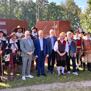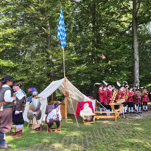 Der Festivalsonntag startete morgens mit einem ökumenischen Gottestdienst an der Wanderweg-Station zum Westfälischen Frieden. Dr. Herbert Siedler, Leiter des Amtes für Landwirtschaft und Forsten, überbrachte den rund 150 Teilnehmern der feierlichen Eröffnung einen Gruß von Staatsministerin Kaniber. Auch der stellvertretende Landrat Franz X. Forman betonte in seinem Grußwort noch einmal die herausragende Bedeutung des LEADER-geförderten Projektes Erlebnisweg Wallensteins Lager für die Region.