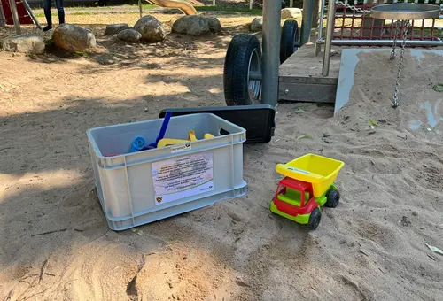 Auf dem sogenannten Weltraumspielplatz in der Linder Siedlung steht nun auf Initiative der Stadtverwaltung eine Kiste mit Sandspielzeug. Alle Kinder können die Sachen aus zweiter Hand gern benutzen, solange sie vor Ort sind.