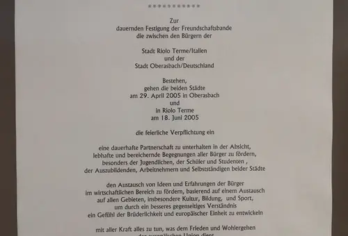 Seit dem 18. Juni 2005 besteht offiziell die Partnerschaft zwischen Oberasbach und Riolo Terme. Gerne hätten wir dieses 15-jährige Jubiläum zusammen gefeiert.