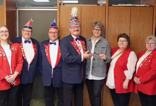 Pünktlich um 11.11 Uhr schallte es am 11. November über den Flur des Rathauses: „BLAU-ROT He-lau!“ Die Närrinnen und Narren der Karnevalsgesellschaft Blau-Rot hatten das Rathaus gestürmt und schritten zur Schlüsselübergabe ins Büro der Ersten Bürgermeisterin.