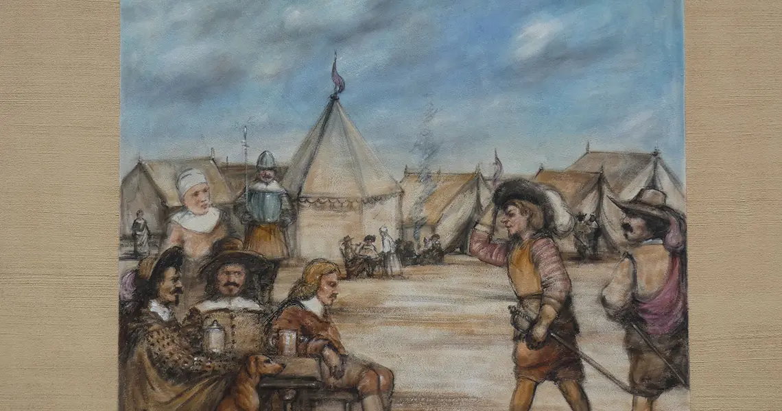 In wochenlanger Feinarbeit entstand das quadratische Gemälde und erinnert an die Geschichte des 30-jährigen Kriegs. Wallensteins gigantisches Feldlager befand sich 1632 genau an der Stelle, auf der jetzt das Wohnhaus steht. Etwa 70 Tage verharrten auf dem heutigen Hainberg-Gelände 50.000 Soldaten und 30.000 Frauen, Kinder und Händler im größten Heerlager der Weltgeschichte. Dieser Krieg mit insgesamt sechs Millionen Toten brachte unendliches Leid und Unglück, die Folgen für Oberasbach und die Region waren verheerend. Dies gilt es immer neu zu erinnern.